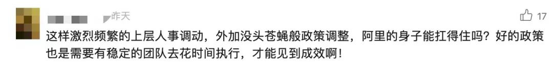 眼下,面對(duì)變化急劇的阿里,也有人提出質(zhì)疑:“這樣激烈頻繁的上層人事調(diào)動(dòng),外加沒頭蒼蠅般政策調(diào)整,阿里的身子能扛得住嗎?”