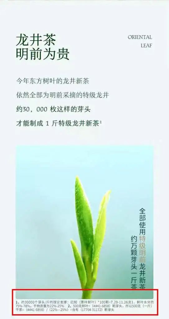 這時候東方樹葉來了,明晃晃地叫賣自家的茶全部來自“地理標(biāo)志產(chǎn)區(qū)的特級明前龍井”,還在宣傳海報里專門給你講解3000顆芽頭的秘密。