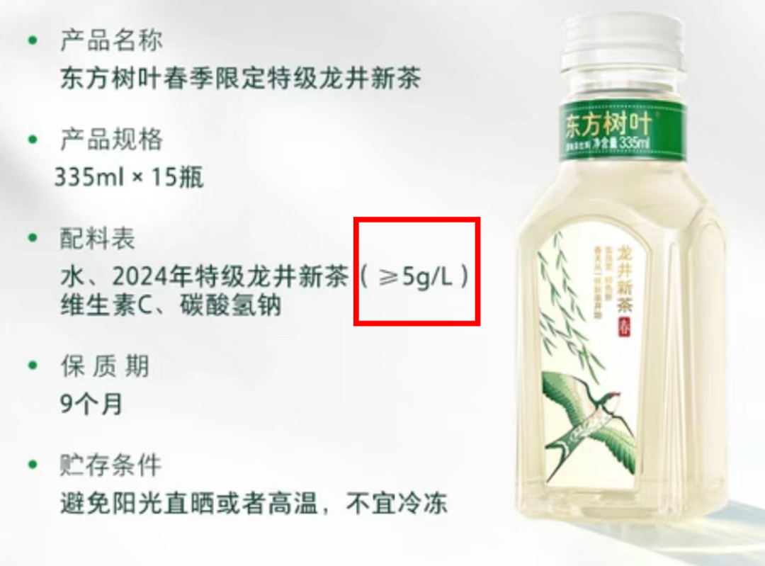 根據(jù)官方宣傳,每升龍井新茶里含有大于等于5克的特級明前龍井。一瓶335ml,一箱15瓶,也就是一箱龍井新茶要消耗25.125g茶葉,今年的10萬箱共需要2.5125噸(5025斤)。