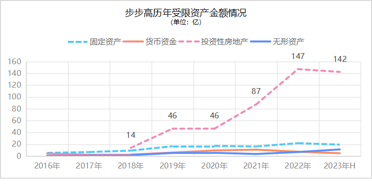 面對巨額投入,步步高不得已將已建成項目和其他資產(chǎn)進(jìn)行抵押借款滿足資金需求。截至2023年上半年,步步高有142.46億元的投資性房地產(chǎn)因借款抵押而資產(chǎn)受限,價值19.24億元的固定資產(chǎn)、11.09億元的無形資產(chǎn)同步受限,相對2022年,受限資產(chǎn)繼續(xù)增加。