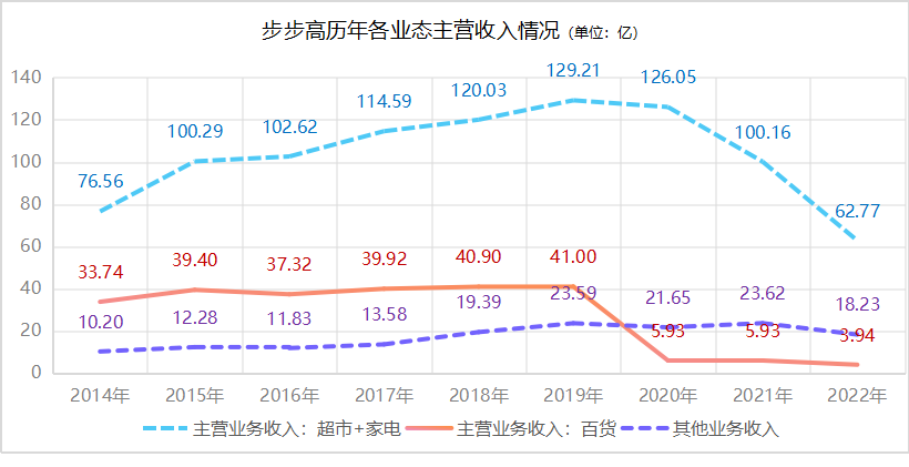 從收入結(jié)構(gòu)來看,各業(yè)態(tài)一榮俱榮,一損俱損,2020年之后,各項主營收入急速下滑。
