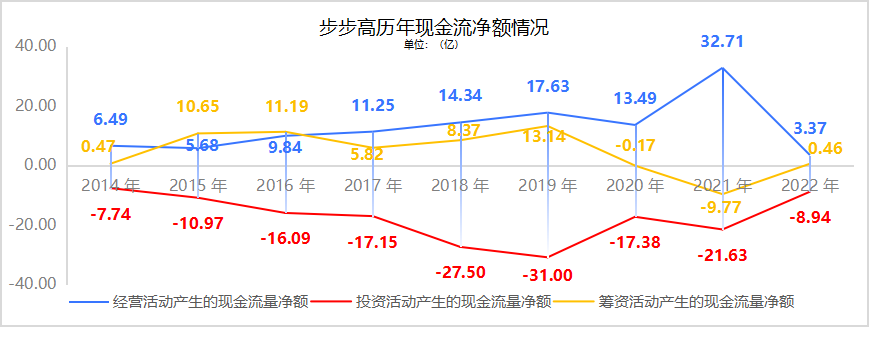 從年報可以看出,從2017年之后,步步高的現(xiàn)金流凈額一直處于虧損狀態(tài),2021年經(jīng)營性現(xiàn)金流增加主要是“報告期內(nèi)優(yōu)化賬期和經(jīng)代銷占比導(dǎo)致經(jīng)營現(xiàn)金支出減少,另報告期執(zhí)行新租賃準(zhǔn)則, 將支付的使用權(quán)資產(chǎn)租金由經(jīng)營活動現(xiàn)金流出劃分為籌資活動的現(xiàn)金流出”,所以籌資性現(xiàn)金流大額轉(zhuǎn)負(fù)。