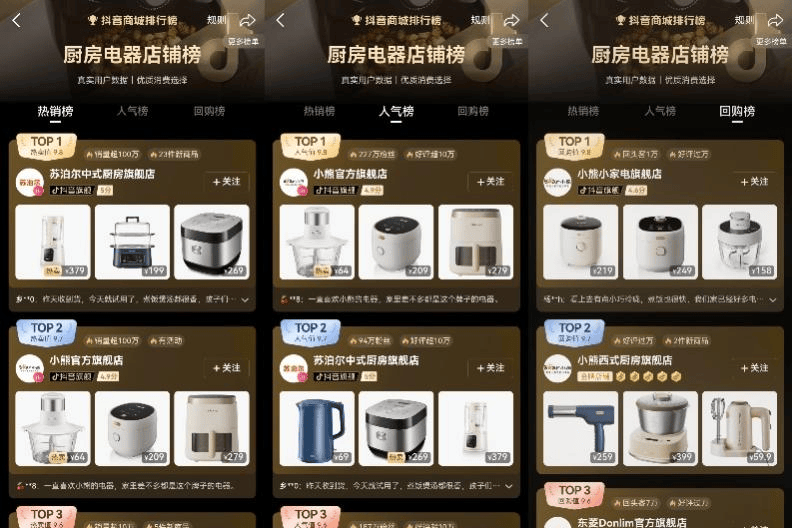 在抖音上,從2023年3月31日至2024年4月10日,近一年時(shí)間內(nèi)小熊電器官方號(hào)在抖音累計(jì)直播384場(chǎng)。在“抖音商城排行榜”中的“廚房電器店鋪榜”,“小熊官方旗艦店”分別在人氣榜、回購榜中排名第一,在熱銷榜中,僅次于“蘇泊爾中式廚房旗艦店”排名第二。