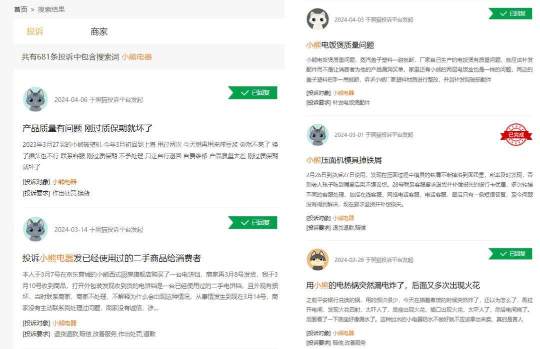 除產(chǎn)品因“雞肋”被吐槽外,小熊電器的產(chǎn)品還曾因質(zhì)量品控問題被投訴。截至4月10日,在“黑貓投訴”官網(wǎng)搜索“小熊電器”關(guān)鍵詞,有681條相關(guān)投訴信息,其中有不少消費(fèi)者反映小熊電器產(chǎn)品存在質(zhì)量不穩(wěn)定、不耐用易損壞等問題。