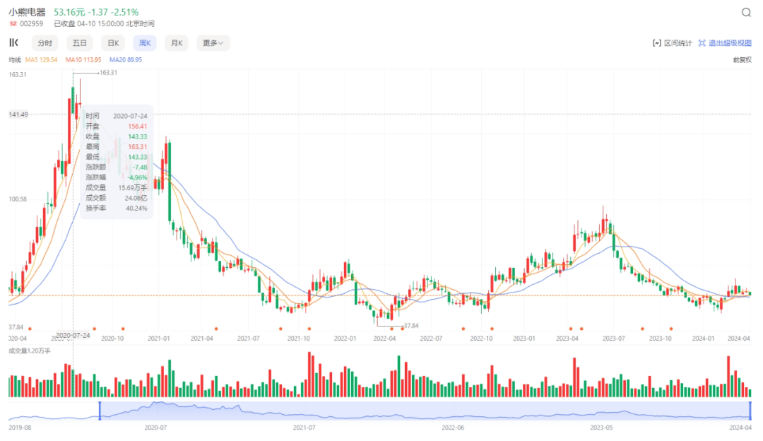 年報(bào)發(fā)布后,小熊電器在二級(jí)市場(chǎng)迎來了短暫的“歡愉時(shí)刻”;截至2024年4月9日收盤,小熊電器股價(jià)為54.53元/股,上漲1.06%。但到了4月10日,小熊電器報(bào)收于53.16元/股,下滑2.51%;到了4月11日收盤,股價(jià)繼續(xù)下滑至51.8元/股。