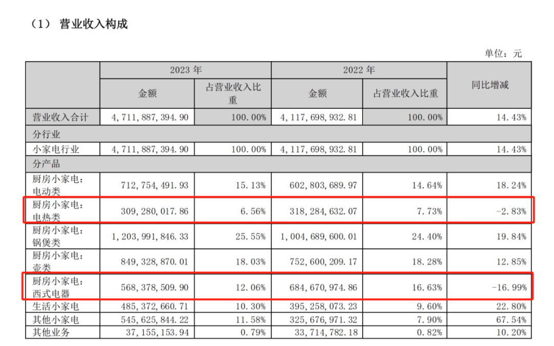 據(jù)財(cái)報(bào)顯示,小熊電器廚房小家電板塊根據(jù)功能進(jìn)一步劃分為鍋煲類、電熱類、壺類、西式類和電動(dòng)類五類產(chǎn)品;其中,電熱類與西式電器類產(chǎn)品的營(yíng)收均有所下滑;下滑最明顯的是西式類,其在2023年的營(yíng)收同比下降了16.99%。