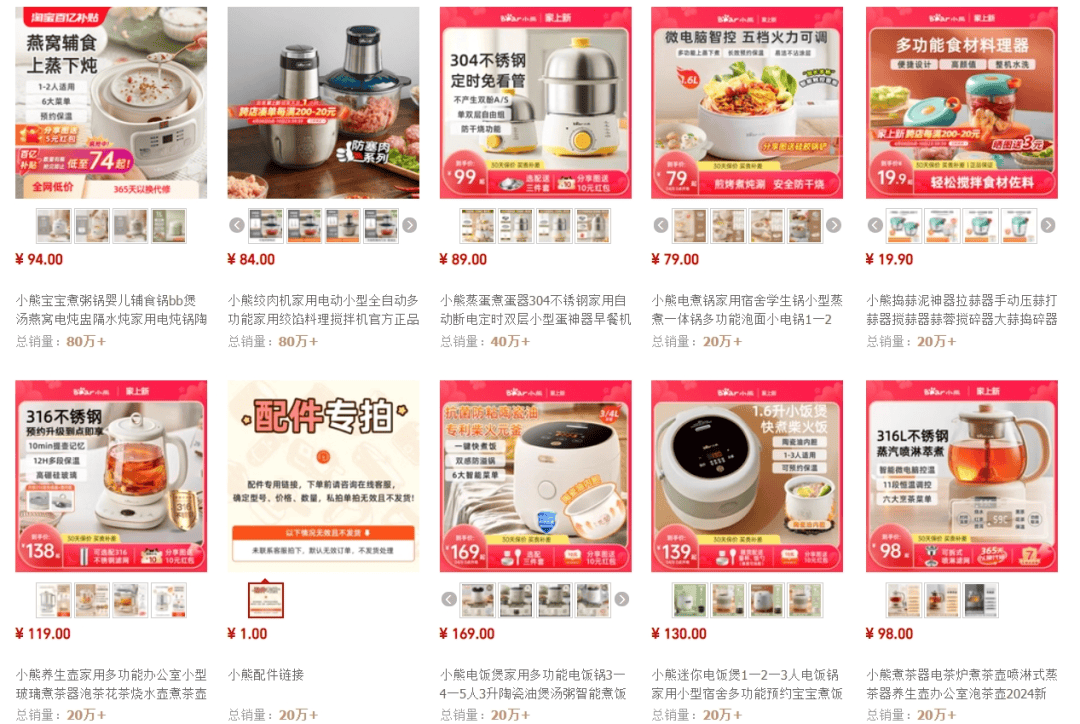 據(jù)“趣解商業(yè)”了解,目前小熊電器天貓官方旗艦店共有超700個(gè)單品,價(jià)格從三千多元到十幾元不等。店內(nèi)在售的產(chǎn)品中,銷量最高有“80萬 ”的產(chǎn)品包括售價(jià)74元的寶寶煮粥鍋和84元的絞肉機(jī);銷量“10萬 ”的產(chǎn)品大部分為廚房小家電,其中大多為電熱水壺、養(yǎng)生壺等產(chǎn)品。售價(jià)最高的是一款售價(jià)3090元的小熊意式咖啡機(jī),其次是2399元的小熊移動(dòng)戶外電源。