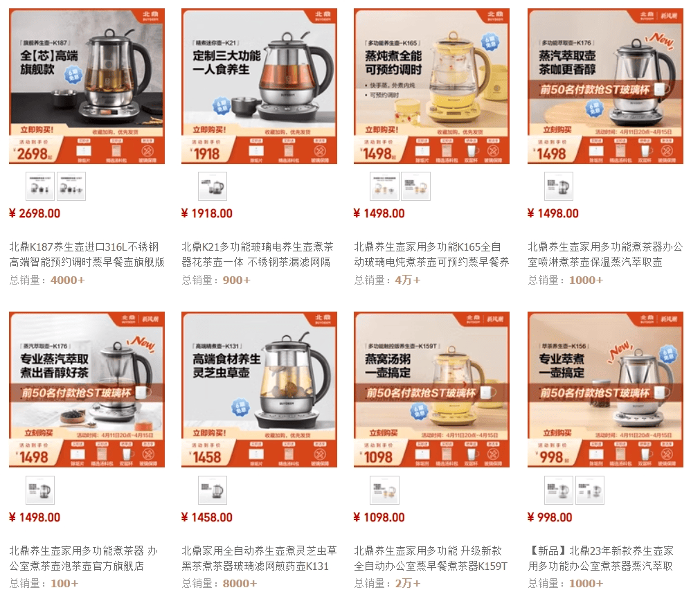 值得一提的是,據(jù)“奧維云網(wǎng)”數(shù)據(jù)顯示,養(yǎng)生壺品類2023年6月的月度均價(jià)為121元,而北鼎的養(yǎng)生壺能賣到上千元。在北鼎的天貓旗艦店里,最貴的一款養(yǎng)生壺售價(jià)達(dá)2698元,顯示有4000 的購買量。