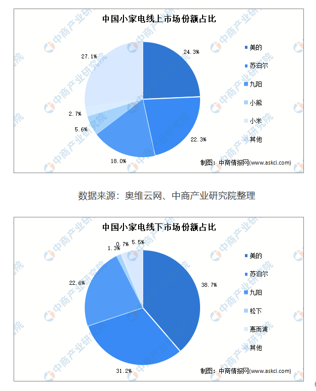 據(jù)“中商情報(bào)網(wǎng)”2022年數(shù)據(jù)顯示,小家電市場(chǎng)呈現(xiàn)美的、蘇泊爾、九陽股份三足鼎立的局面。具體看,在中國(guó)小家電線上市場(chǎng)份額中,上述三家合計(jì)占比64.6%,小熊電器占比僅為5.6%,排名第四;而在線下市場(chǎng)份額排名名單中,并未看到小熊電器的身影。