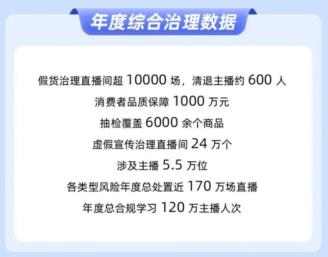 淘寶近日發(fā)布《2023年淘寶直播安全合規(guī)治理報告》(以下簡稱“報告”)顯示,2023年假貨治理直播間超10000場,清退主播約600人,消費者品質(zhì)保障1000萬元,抽檢覆蓋6000余個商品,虛假宣傳治理直播間24萬個,涉及主播5.5萬位,各類型風險年度總處置近170萬場直播,年度總合規(guī)學習120萬主播人次。