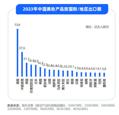 《中國(guó)美妝出海洞察報(bào)告》中的數(shù)據(jù)顯示,2023年中國(guó)美妝產(chǎn)品對(duì)美國(guó)出口額達(dá)73億元,另外日韓市場(chǎng)對(duì)中國(guó)美妝產(chǎn)品的進(jìn)口需求正持續(xù)爆發(fā)。