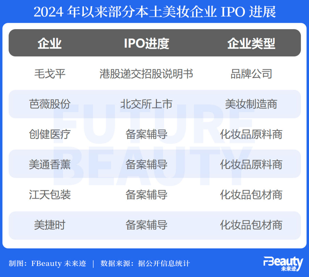 可以發(fā)現(xiàn)的是,國(guó)內(nèi)上市企業(yè)目前集中于原料、包材、服務(wù)商等上下游企業(yè),關(guān)于品牌公司的上市消息不僅在減少,而且多“折戟”。例如,今年唯一一個(gè)有上市動(dòng)態(tài)的品牌公司毛戈平,在1月初撤回在上交所的發(fā)行上市申請(qǐng)后又轉(zhuǎn)戰(zhàn)港股,IPO長(zhǎng)跑已達(dá)8年。