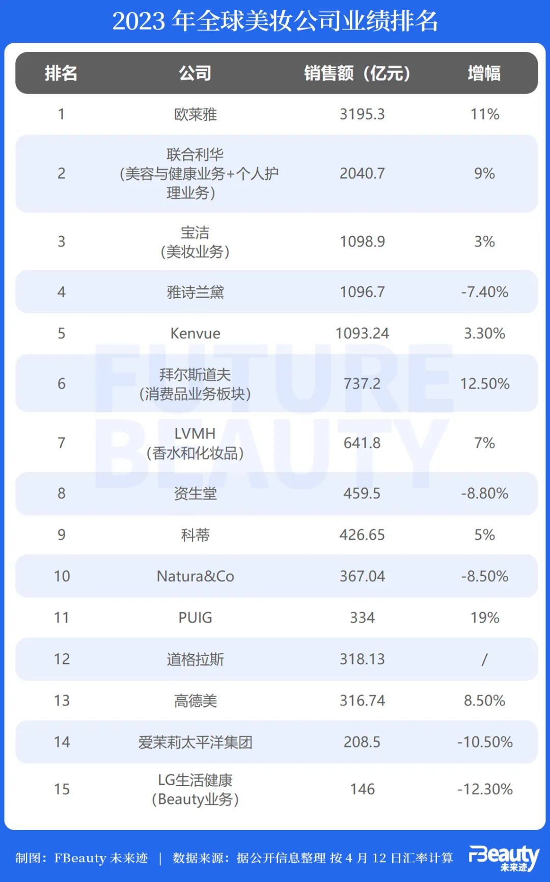 《FBeauty未來跡》梳理了2023年1-12月全球美妝集團(tuán)的化妝品業(yè)務(wù)銷售額情況,頂端的千億級(jí)營(yíng)收公司基本穩(wěn)定,從第六名的拜爾斯道夫開始的“百億級(jí)”美妝集團(tuán)競(jìng)爭(zhēng)激烈,有被新上市的三家公司“挑落”的風(fēng)險(xiǎn)。