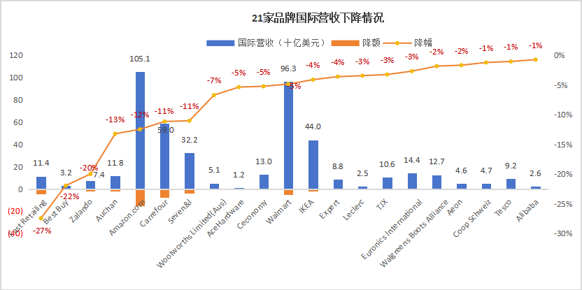 46家品牌中,有21家國際營收出現(xiàn)下降:下降幅度最大的前三家為迅銷(-27.5%)、百思買(-22%)和德國Zalando(-20%);
