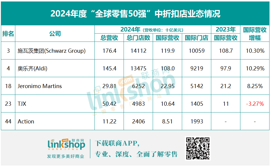 折扣店品牌中,在開展國際化業(yè)務(wù)方面,施瓦茨集團(Schwarz Group)、奧樂齊(ALDI)和葡萄牙的Jeronimo Martins這3家獲得比較好的發(fā)展。