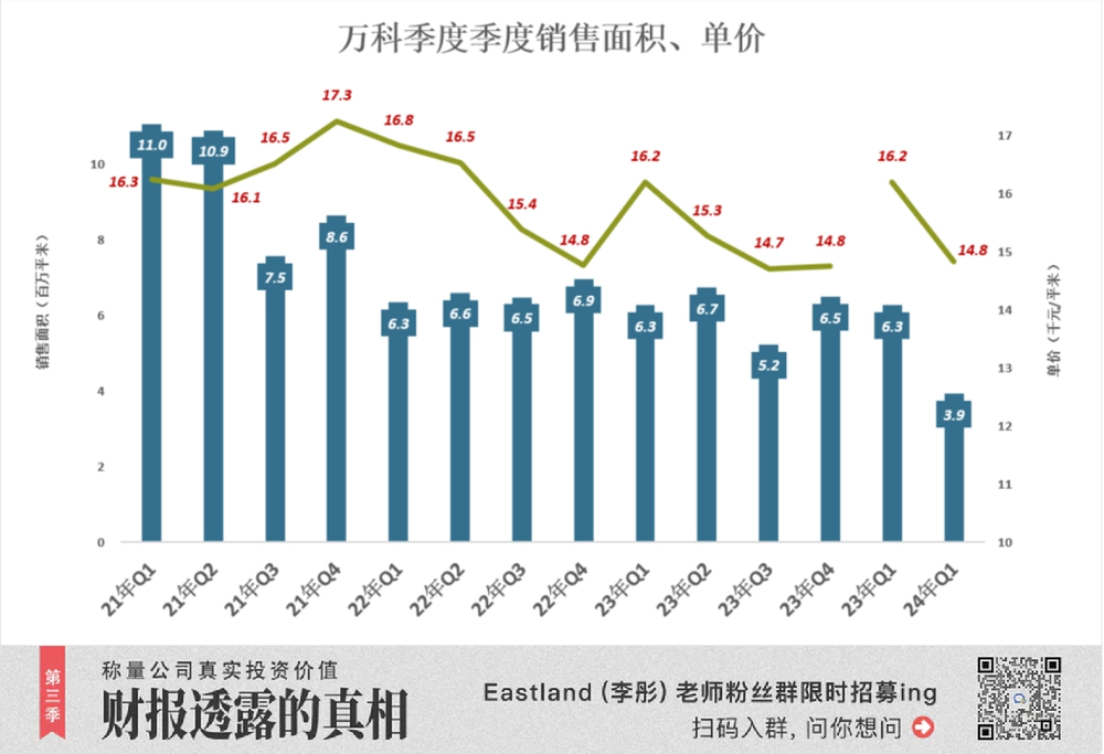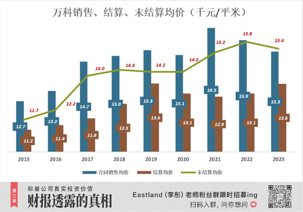結(jié)算的對象是以往的合同銷售,但萬科近年的結(jié)算均價明顯偏低。以2023年為例,結(jié)算均價(1.36萬元/平米)比2022年合同銷售均價低14.5%,比2021年銷售均價低17.7%,比2020年銷售均價低10.1%……