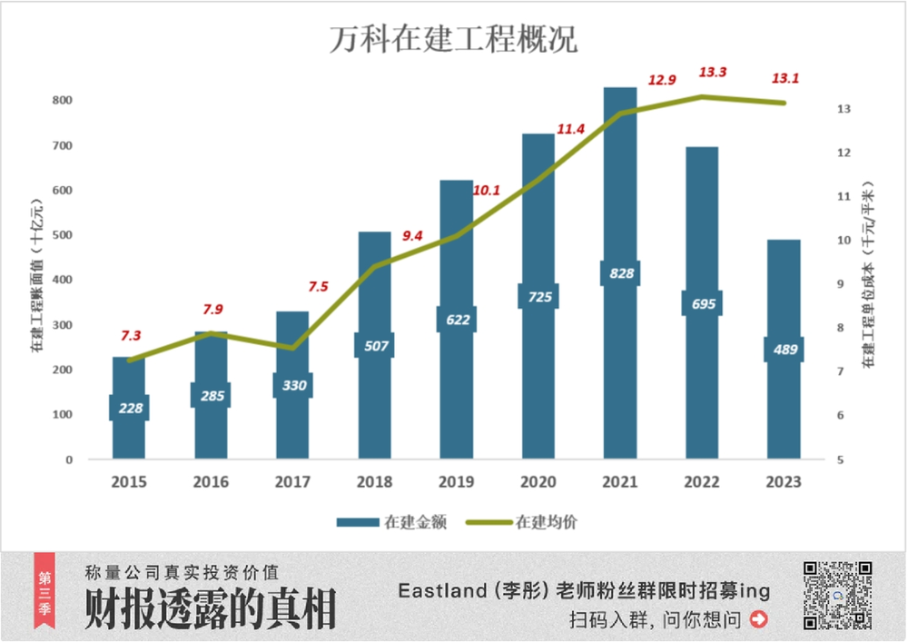 2022年末、2023年末,在建工程單位成本分別為1.33萬元/平米、1.31萬元/平米。分別相當于本財年合約銷售均價的83.7%、86.1%(2015年-2019年,這個比例不到70%)。