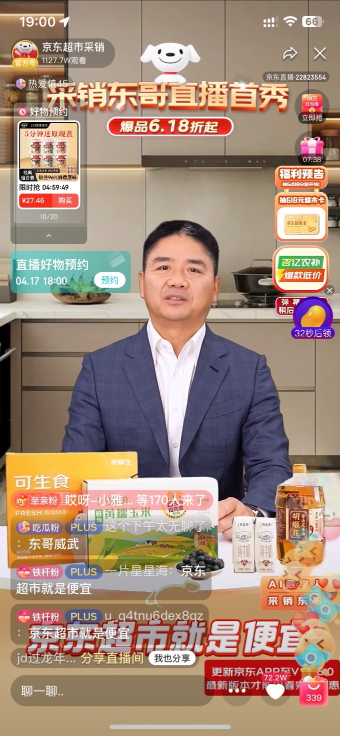 4月16日下午6點(diǎn)18分,京東劉強(qiáng)東以“采銷東哥AI數(shù)字人”的形式空降京東家電家居、京東超市采銷直播間,開(kāi)啟自己的直播首秀。眾多消費(fèi)者來(lái)到直播間跟著“采銷東哥AI數(shù)字人”低價(jià)入手電視、空調(diào)等家電好物,以及各類健康食材。不到1小時(shí),直播間觀看量超2000萬(wàn)!