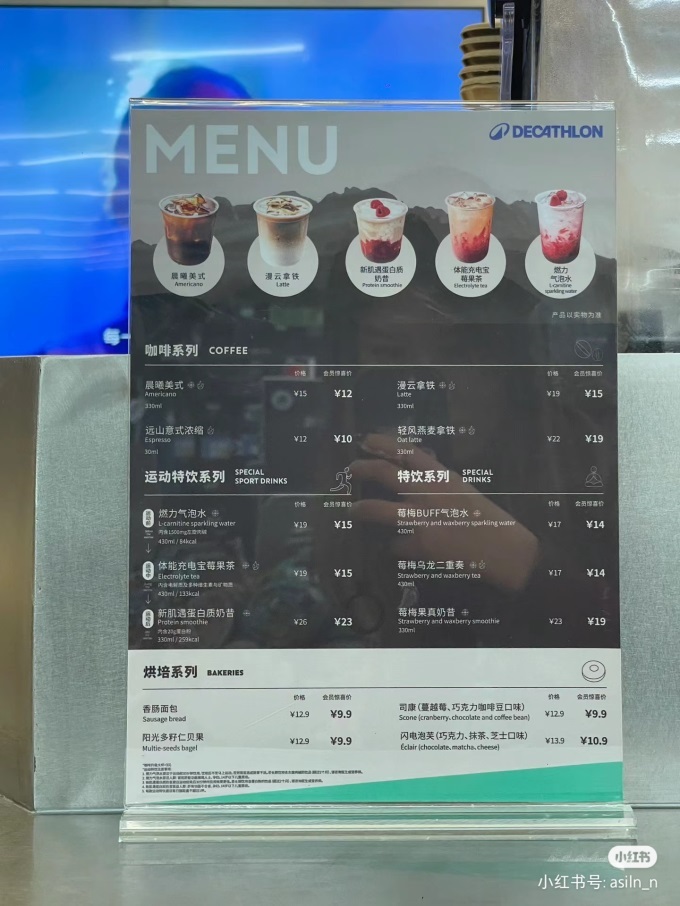 菜單顯示,迪卡儂咖啡角延續(xù)了品牌的平價路線,產(chǎn)品售價并不高,咖啡及特飲等產(chǎn)品價格在12元-26元不等,烘焙產(chǎn)品價格則在12.9元-13.9元,并設(shè)置了會員驚喜價。飲品方面,除咖啡和特飲以外,迪卡儂還推出了含電解質(zhì)、左旋肉堿、蛋白粉等配料的運動特飲系列,作為差異化產(chǎn)品。