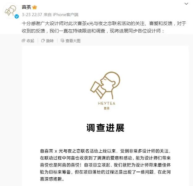 但喜茶開心了沒幾天,就有網(wǎng)友爆料稱本次聯(lián)名中需要購買指定套餐才能獲得的聯(lián)名周邊產(chǎn)品“喜證”在二手平臺遭到低價倒賣,另外早在數(shù)月前本次聯(lián)名周邊產(chǎn)品還曾遭到泄密。3月23日晚,喜茶針對“聯(lián)名周邊被倒賣”等情況公布調(diào)查進(jìn)展,并公開致歉。