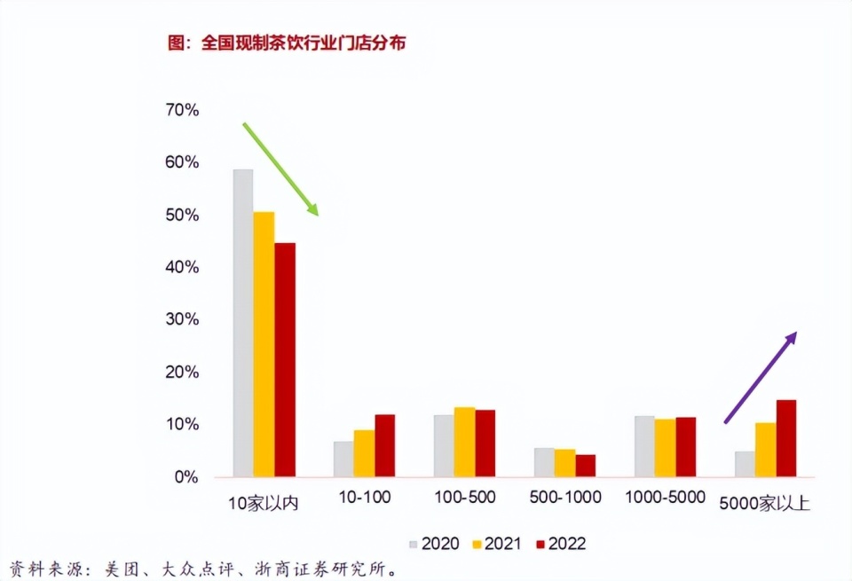 而霸王茶姬想要在門店數(shù)量上追上滬上阿姨們,在搶先用戶心智的同時(shí),占領(lǐng)更大的“原葉鮮奶茶”市場,也絕非易事。根據(jù)浙商證券的研報(bào)顯示,目前我國現(xiàn)制茶飲賽道正處在加速集中的進(jìn)程中,全國現(xiàn)制茶飲門店38萬家,其中擁有連鎖品牌的超過3000家;從2020到2022年的三年間,5000家以上門店品牌占比就提升了3倍,達(dá)到了15%。