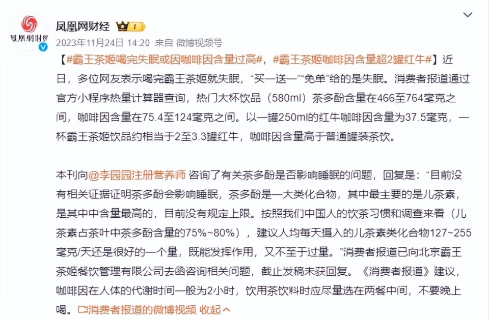 行業(yè)媒體《消費(fèi)者報(bào)道》此前通過霸王茶姬官方小程序熱量計(jì)算器查詢發(fā)現(xiàn),其熱門的580ml大杯飲品茶多酚含量在466至764毫克之間,咖啡因含量在75.4至124毫克之間。對比250ml紅?Х纫蚝康37.5毫克,一杯霸王茶姬飲品約相當(dāng)于2至3.3罐紅牛。