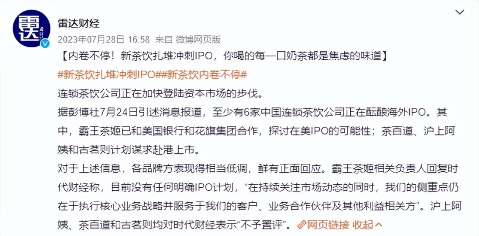 這已經(jīng)不是霸王茶姬第一次被傳要赴美上市了,早在2023年7月時(shí),彭博社就曾報(bào)道稱霸王茶姬在謀求赴美上市;當(dāng)時(shí)國內(nèi)媒體向企業(yè)求證后,得到的回復(fù)是“目前沒有任何明確的IPO計(jì)劃”。