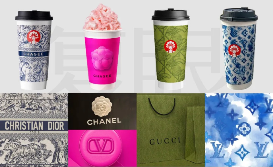 霸王茶姬之后又陸續(xù)推出了“撞臉”香奈兒的山茶花包裝、“撞臉”Gucci的夏夜夢瓏款包裝,以及“撞臉”LV經(jīng)典老花的“小藍(lán)杯”包裝。