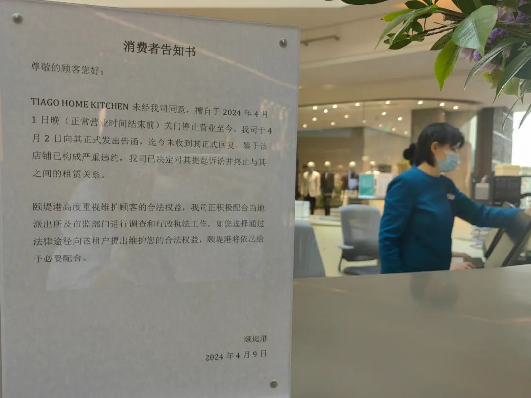 視覺(jué)上看起來(lái),這家店似乎沒(méi)有倒閉,門頭干凈整潔,品牌logo清晰醒目。不過(guò),門口貼了一張以商場(chǎng)口吻發(fā)布的告示,表示“Tiago未經(jīng)我司同意,擅自關(guān)門停業(yè)”。