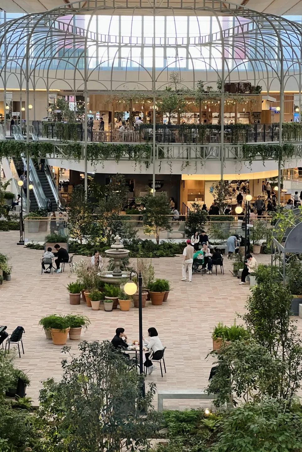 以“自然友好”的概念為核心,項目中近一半的銷售面積都被打造成了室內(nèi)景觀和休息區(qū),如此大手筆的場景打造背后,也有著現(xiàn)代百貨首爾對于“購物療法”的創(chuàng)新實踐——