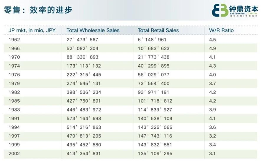 鐘鼎資本曾通過梳理日本1962-2002年的批發(fā)、零售數(shù)據(jù),驗(yàn)證了零售業(yè)態(tài)演化背后的效率持續(xù)提升。