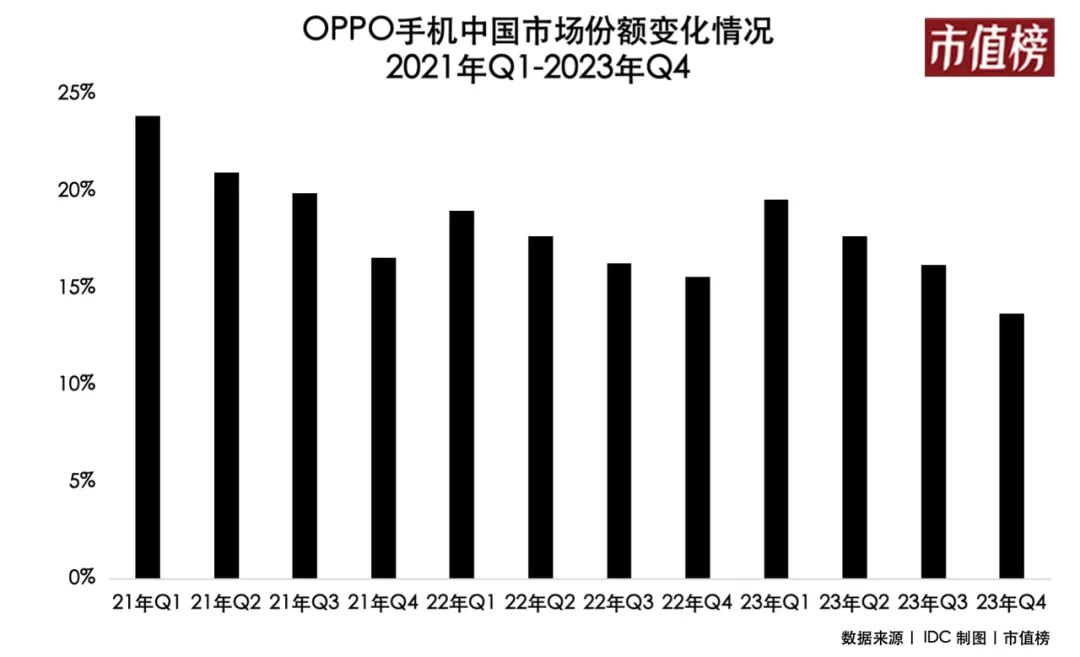 BCI數(shù)據(jù)顯示,OPPO(含OnePlus、realme)在中國手機激活量2023年四季度同比下跌15.1%,東南亞市場OPPO手機出貨量360萬臺,同比下跌27%,即使在火熱的印度手機市場,OPPO手機出貨量也下跌了5%,是排名前五中唯一下跌的品牌。