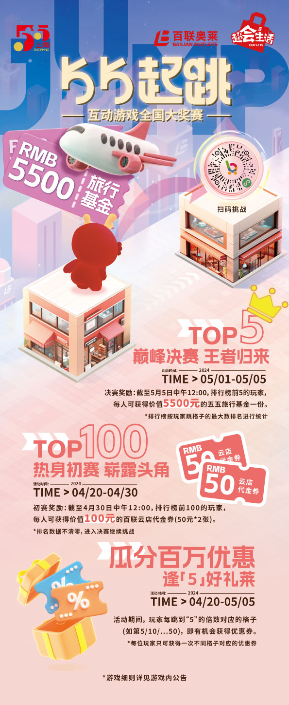 快樂的人總先享受生活,在愜意“出逃”中喚醒假日美好。除低價精致好物外,百聯(lián)奧萊還為消費者準(zhǔn)備了出游驚喜。4月20日-5月5日,在百聯(lián)云店參加“跳一跳”小游戲挑戰(zhàn)賽,決賽排名前五的玩家可獲得5500元旅行基金。初賽排名前100名的玩家可領(lǐng)取價值100元的百聯(lián)云店優(yōu)惠券。其他玩家也有機(jī)會贏得品牌優(yōu)惠券和更多購物驚喜。