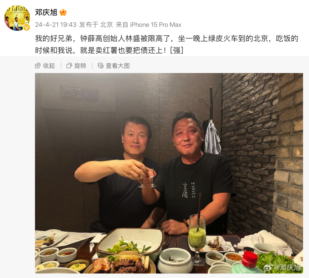 2024年4月21日,鐘薛高創(chuàng)始人林盛在被“限高”后,坐一晚上綠皮火車來到北京,與新浪財(cái)經(jīng)CEO鄧慶旭共進(jìn)晚餐。此事被后者發(fā)布在微博上,引發(fā)熱議。
