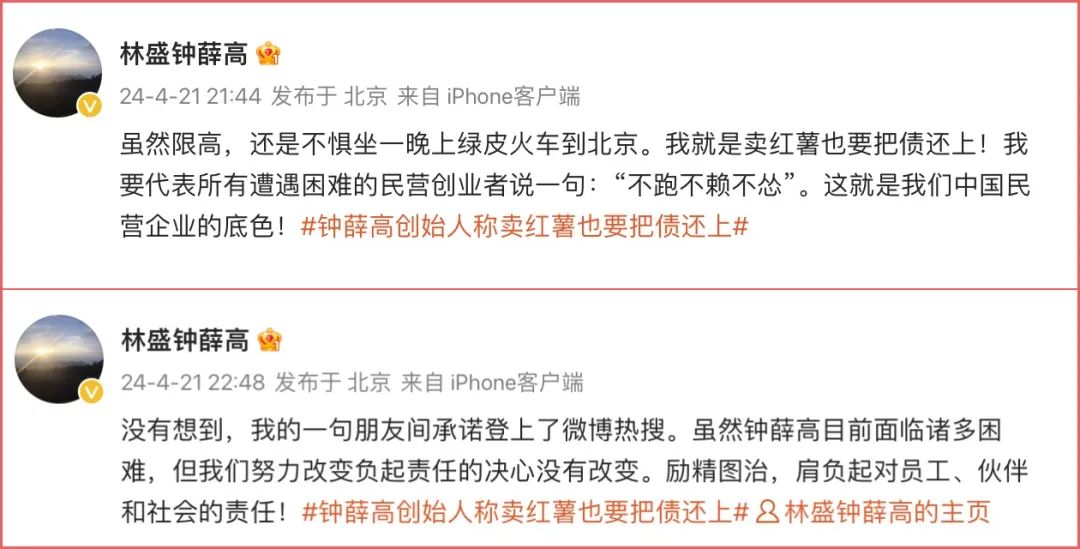 同日稍晚,林盛連續(xù)發(fā)布兩條微博,強(qiáng)調(diào)“不懼坐一晚上綠皮火車到北京”“我就是賣紅薯也要把債還上”。兩條微博均掛上#鐘薛高創(chuàng)始人稱賣紅薯也要把債還上#的話題,該話題經(jīng)過發(fā)酵后登上熱搜榜。