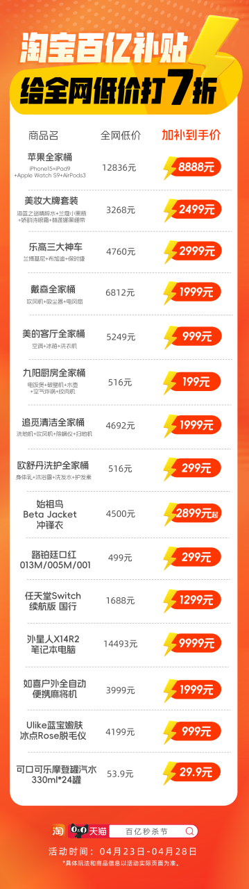 4月23日晚8點(diǎn),淘寶將啟動(dòng)“百億秒殺節(jié)”,在全網(wǎng)低價(jià)基礎(chǔ)上,再打7折。蘋果“全家桶”iPhone15、iPad、Watch、AirPods 全套僅8888元;戴森吹風(fēng)機(jī)、吸塵器、電風(fēng)扇“全家桶”僅1999元;美妝“四大硬通貨”海藍(lán)之謎精粹水、蘭蔻小黑瓶、嬌韻詩眼霜和赫蓮娜黑繃帶,全套僅2499元。樂高蘭博基尼、布加迪、保時(shí)捷“三大神車組合”僅2999元。