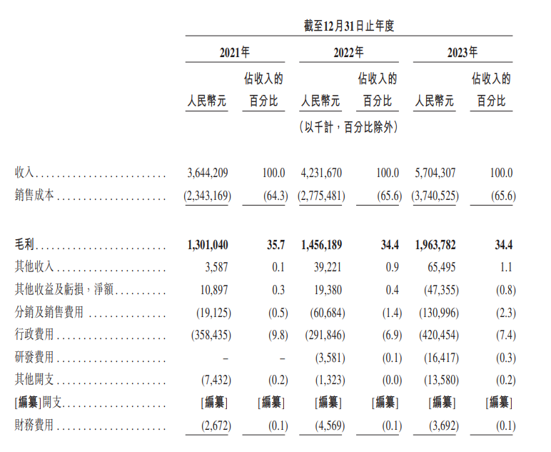 從營收來看,茶百道的收入從2021年的36.44億元增長16.1%至2022年的42.32億元,2023年進(jìn)一步增長34.8%至57.04億元;凈利潤由2021年的7.79億元增長23.9%至2022年的9.65億元,2023年增長19.3%至11.5億元。同期,茶百道的毛利率分別為35.7%、34.4%及34.4%。