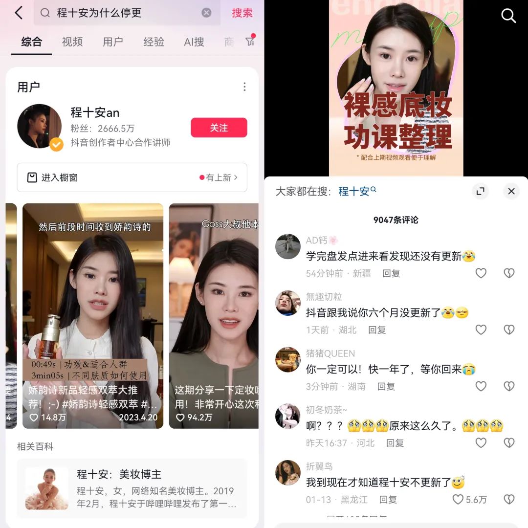 2023年5月4日,坐擁千萬(wàn)粉絲的美妝博主程十安在抖音發(fā)完最后一條裸妝教學(xué)的視頻后,毫無(wú)預(yù)兆地停更了。