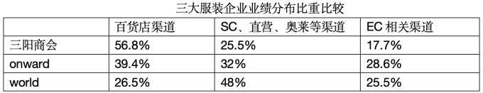 近年來,日本的大型服裝企業(yè)在快速轉變營銷戰(zhàn)略,過去主打百貨店渠道的三大服裝商,目前堅持百貨店為主渠道的只有三陽商會,onward、world已經分化營銷渠道。