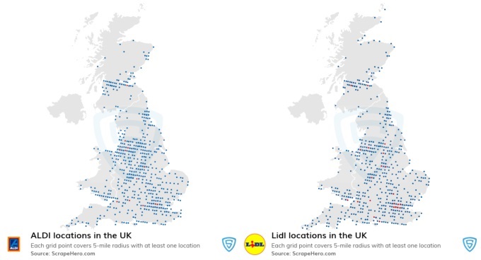 Aldi和Lidl在英國的門店分布情況。圖源:ScrapeHero