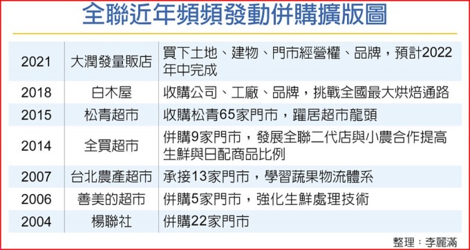 臺(tái)灣全聯(lián)近年頻頻發(fā)動(dòng)并購擴(kuò)張版圖 (尤其是2021年開始啟動(dòng)并購臺(tái)灣大潤發(fā), 并于2022年中完成并購案, 在市場最負(fù)盛名)