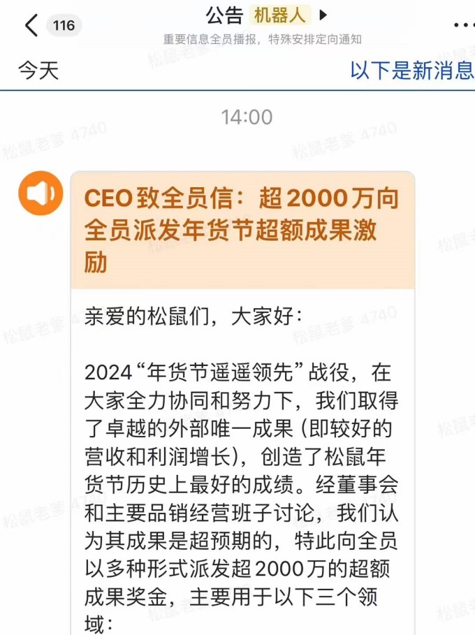 聯(lián)商快訊:4月24日消息,《聯(lián)商網(wǎng)》獨(dú)家獲悉,今天下午,三只松鼠內(nèi)部發(fā)布《CEO致全員信:超2000萬向全員派發(fā)年貨節(jié)超額成果激勵》。