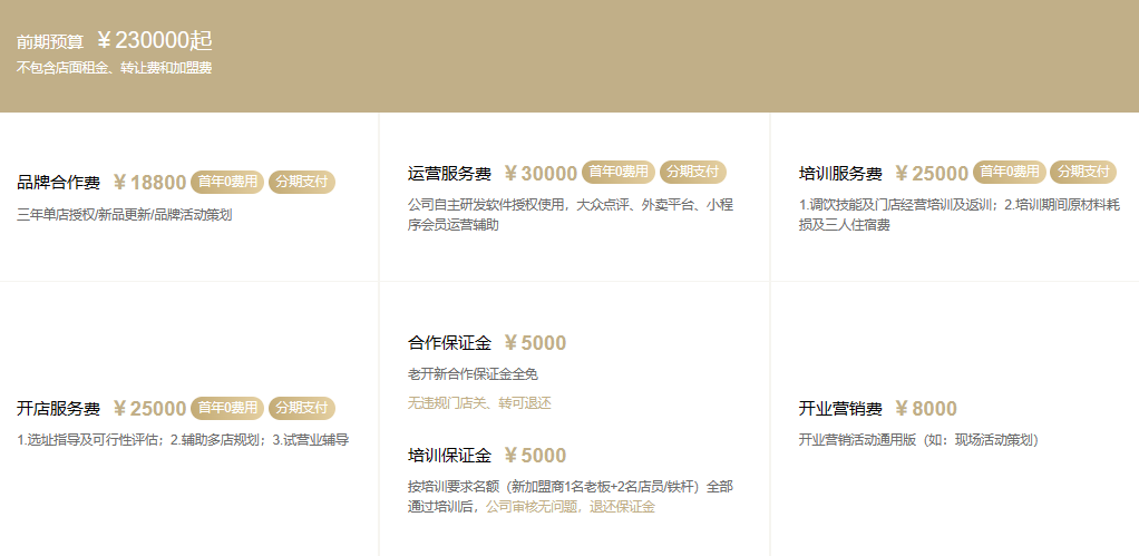 還能從加盟費(fèi)上大賺一筆的時(shí)代似乎一去不復(fù)返了。近幾日,鋅刻度從古茗官方處了解到,包含18800元的品牌合作費(fèi)、30000元的運(yùn)營服務(wù)費(fèi)、25000元的培訓(xùn)服務(wù)費(fèi)以及25000元的開店服務(wù)費(fèi)如今都有了首年0費(fèi)用的優(yōu)惠政策,即總計(jì)9.88萬元的加盟費(fèi)可以在三年合同期內(nèi)分期付款,簽約后第13個(gè)月收取2.5萬,第19個(gè)月再收取4.88萬;第25個(gè)月收取剩余的2.5萬元。