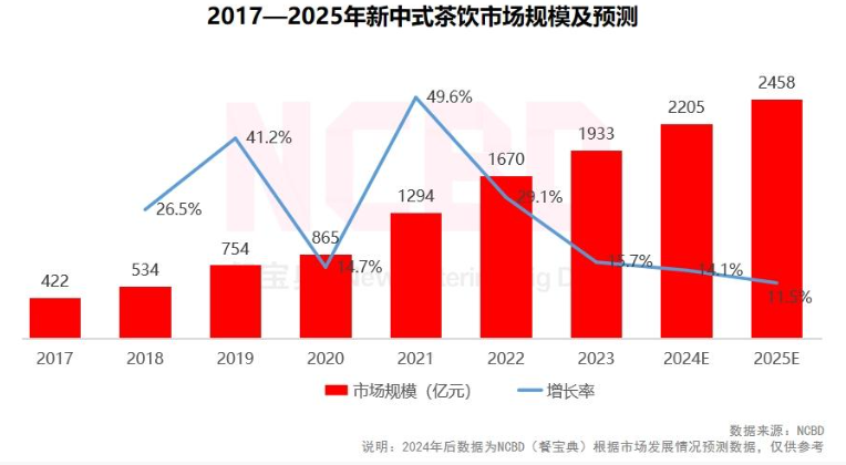 盡管近幾年新茶飲賽道的聲量大不如前,但大盤仍在。NCBD(餐寶典)近日發(fā)布《2023—2024中國茶飲行業(yè)年度發(fā)展報(bào)告》顯示,2023年,新中式茶飲市場規(guī)模達(dá)1933億元,同比增加15.7%,預(yù)計(jì)到2025年,新中式茶飲市場規(guī)模將逼近2500億元。