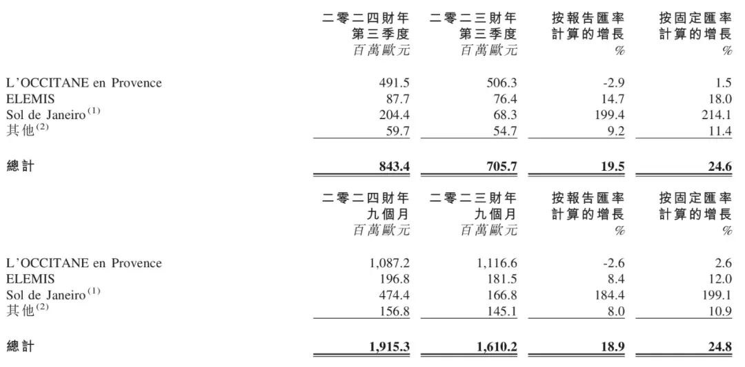 據(jù)歐舒丹財(cái)報(bào)數(shù)據(jù),2024財(cái)年前九個(gè)月銷售額達(dá)到19.153億歐元(約合人民幣148.83億元),同比增長(zhǎng)18.9%。將近150億元的營(yíng)收增長(zhǎng)離不開三大功臣:L’OCCITANE en Provence、Elemis和Sol de Janeiro。
