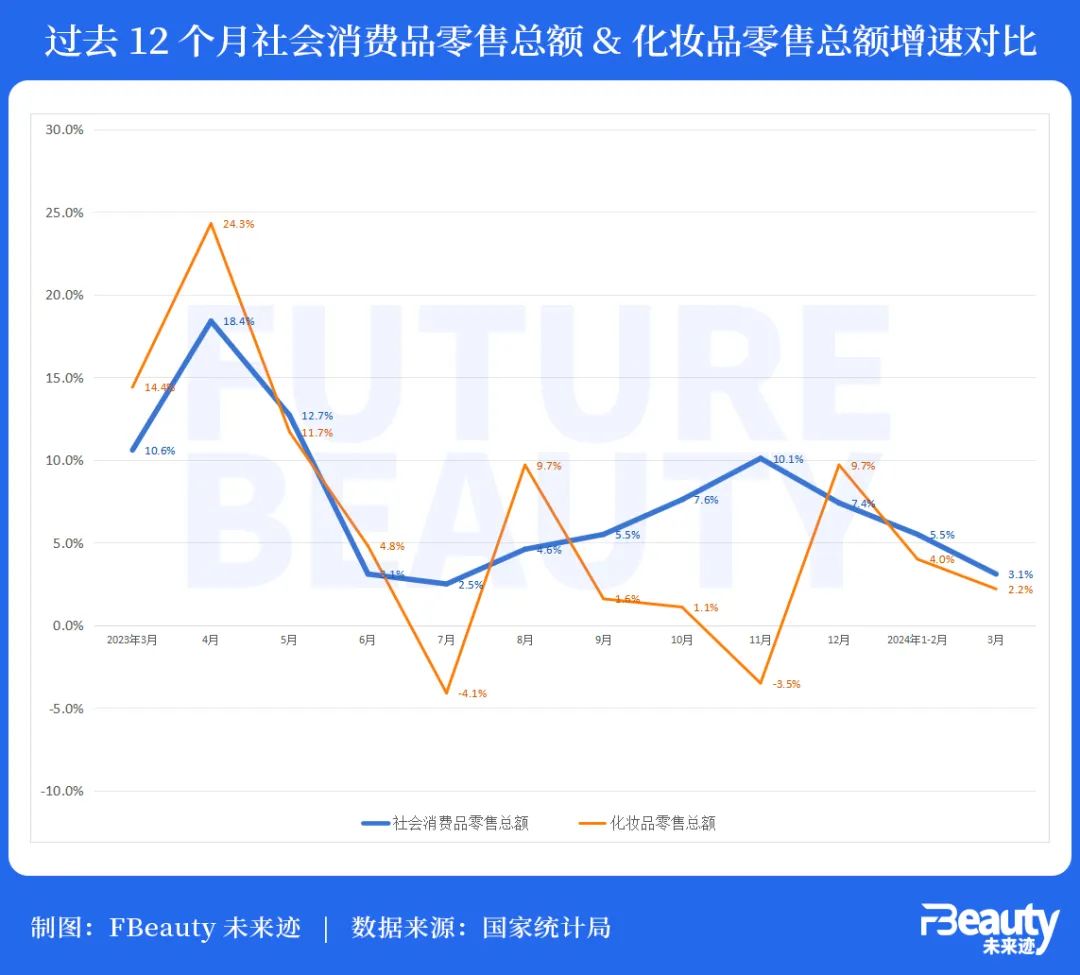 就美妝市場來看,根據(jù)國家統(tǒng)計局發(fā)布的2024年3月份社會消費品零售總額情況,化妝品在今年一季度的總銷售額達1086億元,同比增長3.4%,增速低于總體零售大盤?梢灶A(yù)見的是,化妝品市場似乎正迅速從“慢增長時代”走向“微增長時代”,甚至未來還要做好迎接“0增長時代”的準備。