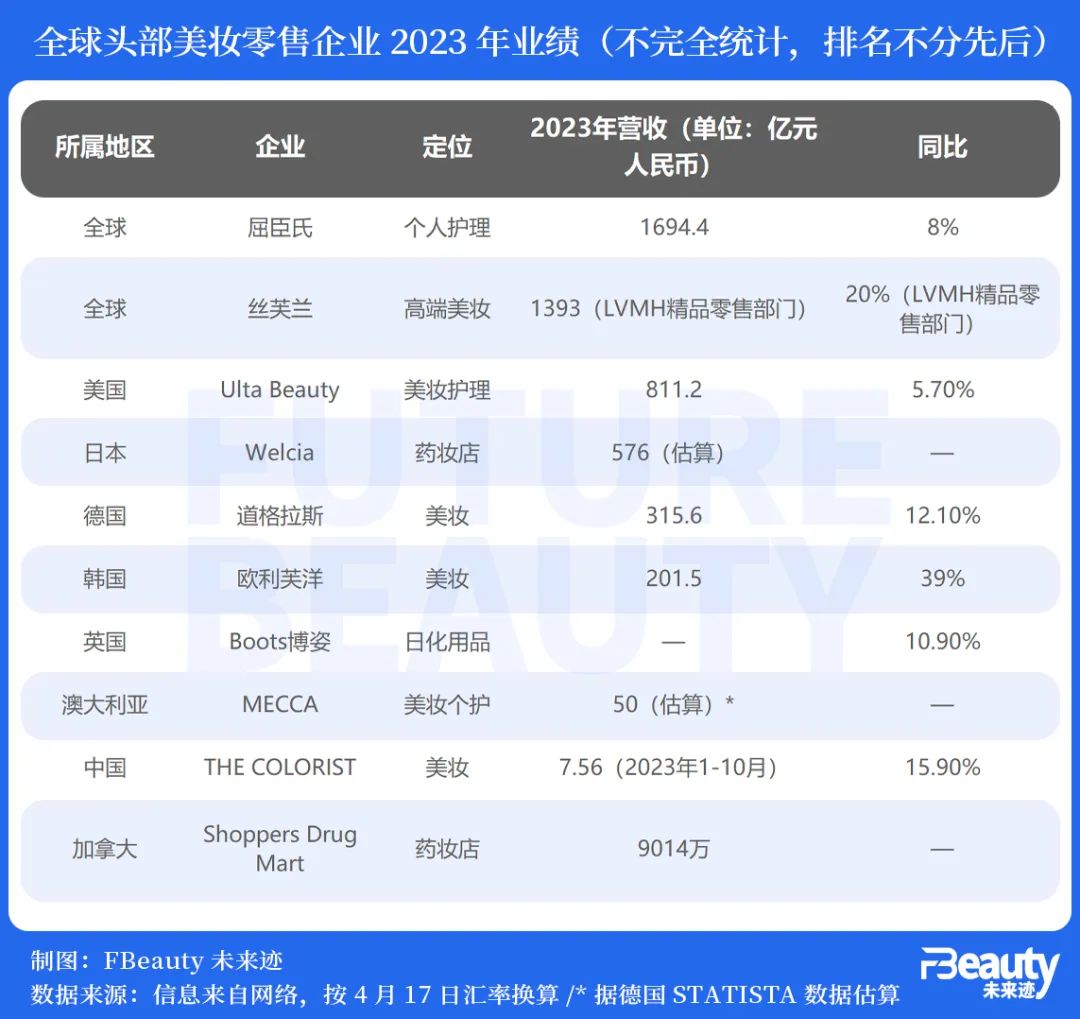 根據(jù)全球8家已公布2023年業(yè)績情況的頭部美妝零售企業(yè),屈臣氏集團以1694.4億人民幣的收入位列第一,其次營收達811.2億元人民幣的Ulta Beauty。