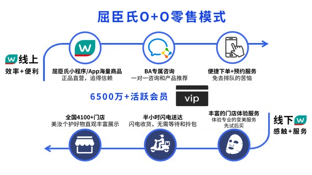 其中最具代表性的便是屈臣氏于2018年開啟的O+O(線下及線上)轉(zhuǎn)型策略,這一策略簡單來說就是從消費者需求出發(fā),將門店與小程序、企業(yè)微信、社群等多元化數(shù)字觸點進行融合,線上與線下貫通一體,為用戶打造消費體驗閉環(huán),從而提高顧客留存與復(fù)購率。