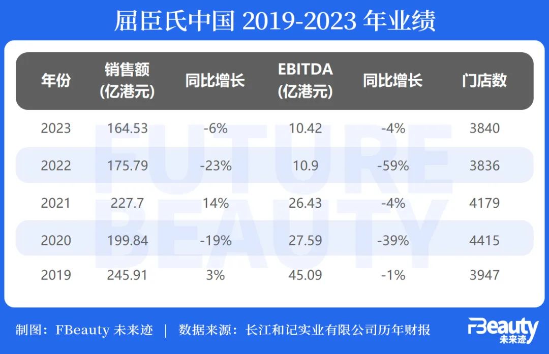 根據(jù)屈臣氏所屬集團長江和記發(fā)布的最新財報,屈臣氏在中國市場中保健及美容產(chǎn)品的全年收益總額為164.53億港幣(約合人民幣152.1億),同比下滑6%;EBITDA(注:稅息折舊攤銷前利潤)為10.42億港幣(約合人民幣9.63億),同比下滑4%。