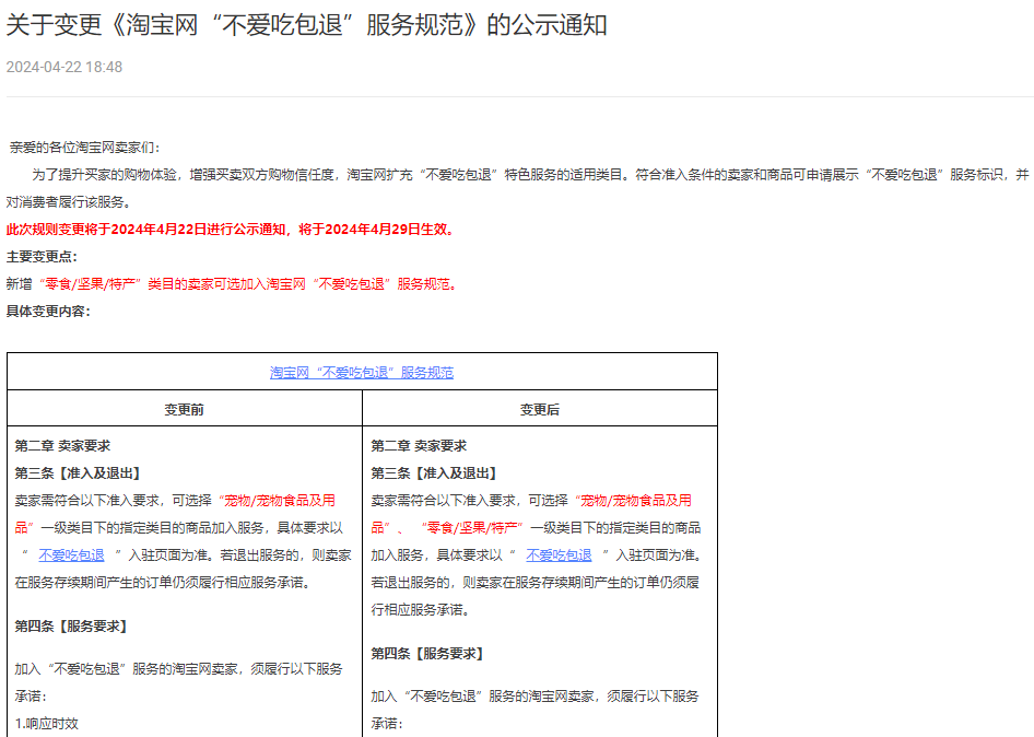 日前,淘寶發(fā)布了“不愛(ài)吃包退”服務(wù)規(guī)范的變更通知,將于4月29日正式生效。